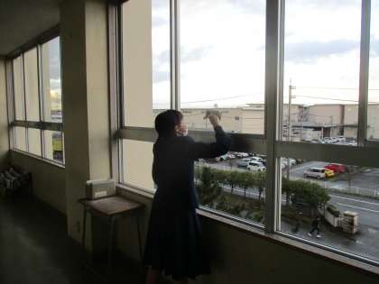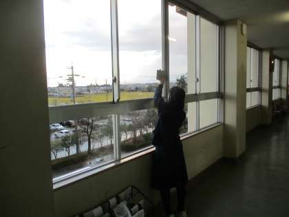 (写真:廊下の窓ガラスを清掃する3年生部員)