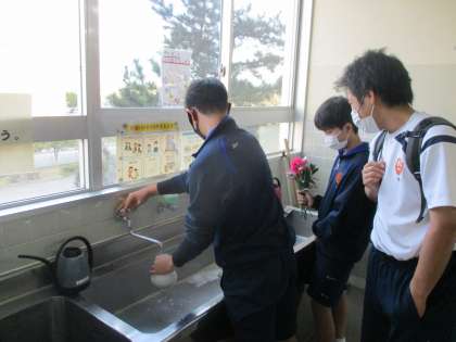 12月2日(水) 16:00 放課後、2年・美化実践部員が常時活動で2階手洗い場の清掃を行っています。