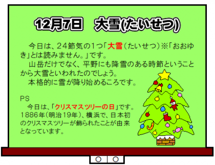 今日は、「大雪(たいせつ)」です! 公開日 2020/12/07 更新日 2020/12/07 今日の興南中 12月7日(月) 20:00 今日は、24節気の一つ「大雪(たいせつ)」です。 だって、14日(月)から、天気予報に「雪マーク」がでています!