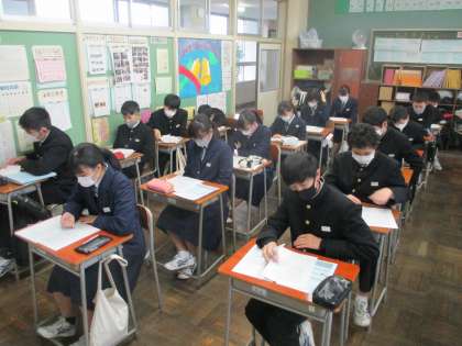 人権週間・3日目 公開日 2020/12/08 更新日 2020/12/08 今日の興南中 12月8日(火) 8:20 今週は「人権週間」です。 毎朝、人権に関する作文の朗読を聴いたり、読んだりして人権問題について考えています。 今日は作文「曾祖母との関わりから見えてきたこと」を読みました。 (写真:2年1組)