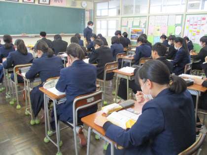 3年・授業風景 公開日 2020/12/14 更新日 2020/12/14 今日の興南中 12月14日(月) 6限 2学期も残り2週間となりました。 今学期予定していたテストも終わり、少しホッとした様子で授業を受けています。 どのクラスも先生の話を聞く姿勢は立派です。 (写真 上:3年1組 数学の授業) (写真 中:3年2組 理科の授業) (写真 下:3年3組 社会の授業)