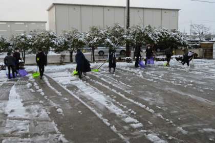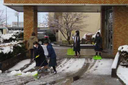 早速、除雪当番の2年2組が、生徒玄関前(写真:上)、正面玄関前(写真:下)の除雪をしています。