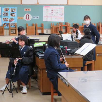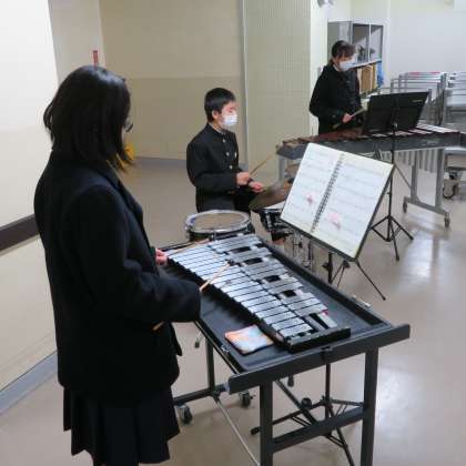 保護者懇談会中は4階では部活動できないので、吹奏楽部は1階でパートごとに練習しています。
