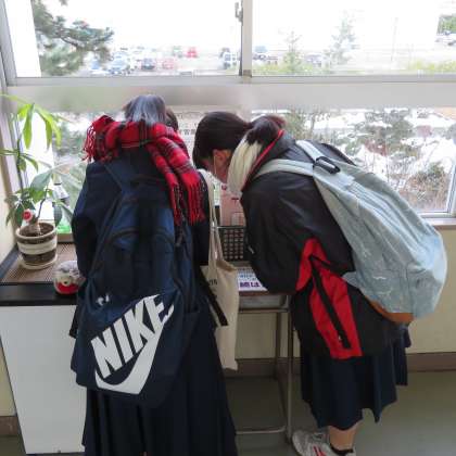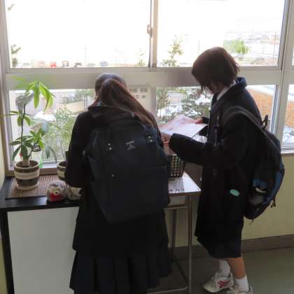 2学期最終週、今朝も問題集を職員室前に取りにきています。(写真)