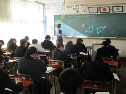 (写真 上:2年1組 数学 平行四辺形の証明問題)