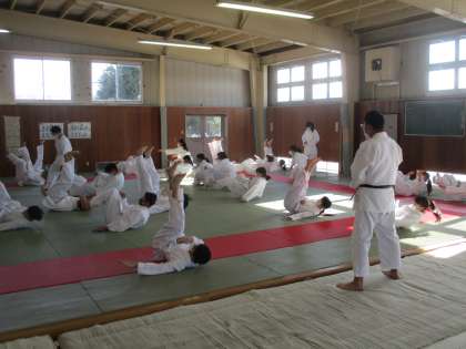 (写真 下:2年3組 保体 柔道の受け身の練習)