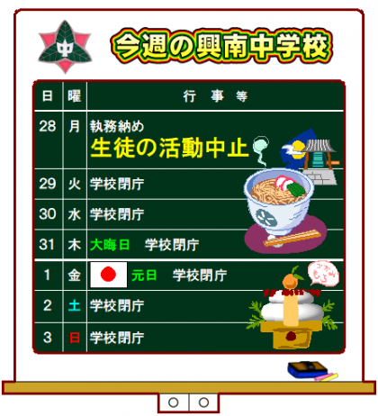 明日28日(月)は執務納めになり、29日(火)からは学校閉庁になります。