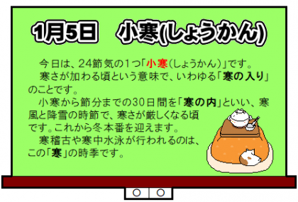 今日は「小寒」です! 公開日 2021/01/05 更新日 2021/01/05 今日の興南中 1月5日(火) 8:00 気温は4度、天気はくもり。 今日は「小寒」、寒さが厳しくなるのは当たり前です。 万全な防寒で暖かくして過ごしましょう!