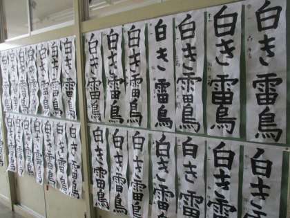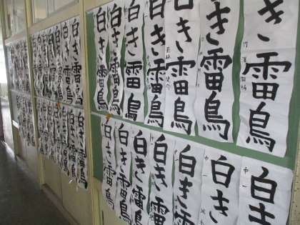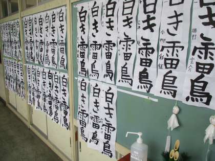 (写真:書初を各教室前廊下に掲示しました。)