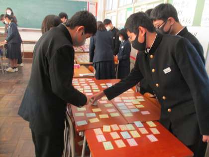 (写真 上:1年1組 国語の授業 百人一首)