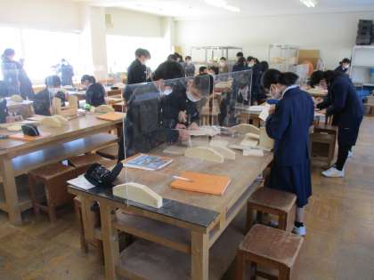 (写真 中:1年2組 技術の授業 本箱製作)
