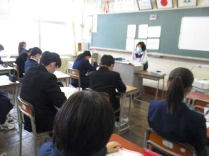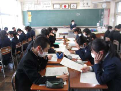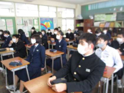 (写真 上:2年1組 県内の上級学校の説明を聞いています)