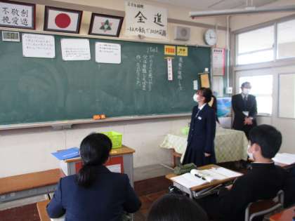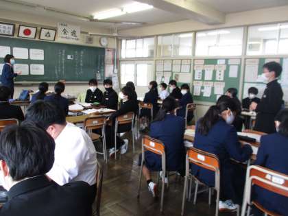 生徒は班の意見を発表したり、感じたことをノートに書いたりしながら考えを深めました。