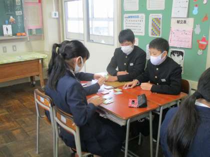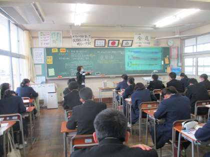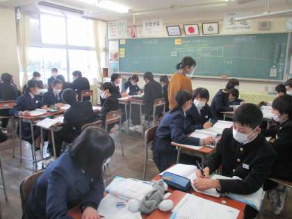 2年・授業風景 公開日 2021/01/27 更新日 2021/01/27 今日の興南中 1月27日(水) 2限 2年生、今日も授業がんばっています! (写真 上:2年1組 理科 次回の授業で行う実験の説明) (写真 中:2年2組 英語 班で賛成・反対の意見発表中) (写真 下:2年3組 国語 百人一首)
