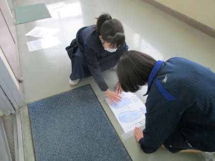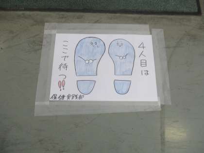 1月27日(水) 15:55 放課後、保健実践部員がトイレ前で、コロナ対策のための目印を設置しています。