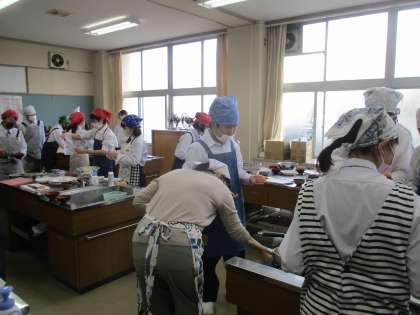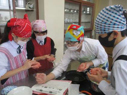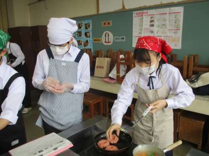 1年・家庭科・調理実習 公開日 2021/01/28 更新日 2021/01/28 今日の興南中 1月28日(木) 1限 1年1組の家庭科は、「五感が喜ぶ煮込みハンバーグ」の調理実習を行いました。 ハンバーグを焼く香ばしい香りが家庭科室に立ちこめています。