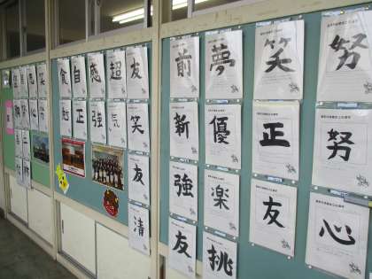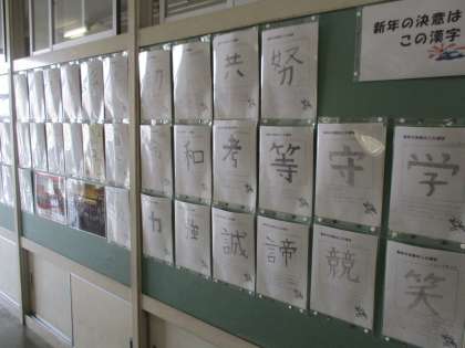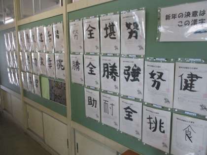 1年教室の廊下には、学活の授業で書いた「今年の漢字」が掲示されています。