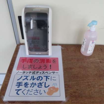 今日から、正面玄関、事務室前、職員室前、校長室前に「ノータッチ式ディスペンサー」を導入しました。