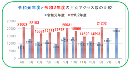 上のグラフは、昨年度(令和元年度)と今年度(令和2年度)の月別アクセス数を比較したものです。