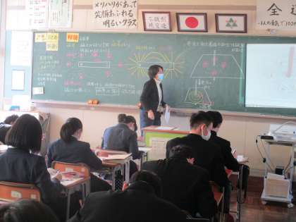(写真 下:2年3組 数学 確率についてグループで話合い)