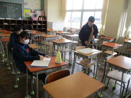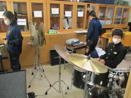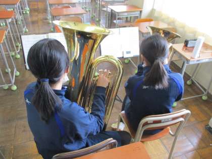 2月最初の休日練習 吹奏楽部 公開日 2021/02/06 更新日 2021/02/06 今日の興南中 2月6日(土) 10:30 吹奏楽部は、来年度のコンクール曲の練習にとりかかりました。 曲を聴いてイメージを確認してから練習スタートです。 (写真 上:ユーフォ・チューバパート 一音一音丁寧に音とり) (写真 中:サクソフォンパート 先輩がスケールを見てくれました) (写真 下:パーカッションパート CDを聴いて楽器の振り分け)