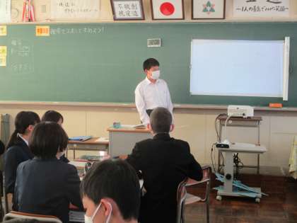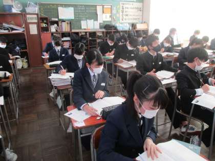 2年・授業風景 公開日 2021/02/09 更新日 2021/02/09 今日の興南中 2月9日(火) 2限 外は寒いですが、授業は活気にあふれています。 (写真 上:2年1組 理科 磁界についての学習) (写真 中:2年2組 数学 班で考えた意見を発表中) (写真 下:2年3組 国語 主人公の心情の変化を考察中)