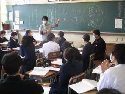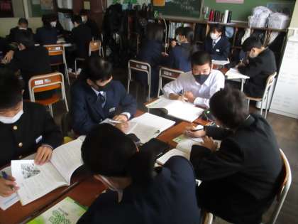 1年・道徳 公開日 2021/02/10 更新日 2021/02/10 今日の興南中 2月10日(水) 3限 今日の教材は、「裏庭でのできごと」です。 休み時間に窓ガラスを割ってしまった登場人物の葛藤を通して、自律的な行動、責任について考えを深めました。 (写真 上:1年1組 中:1年2組 下:1年3組)