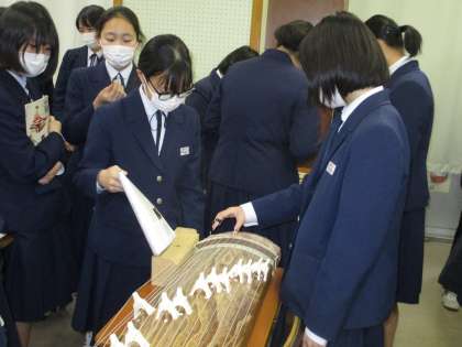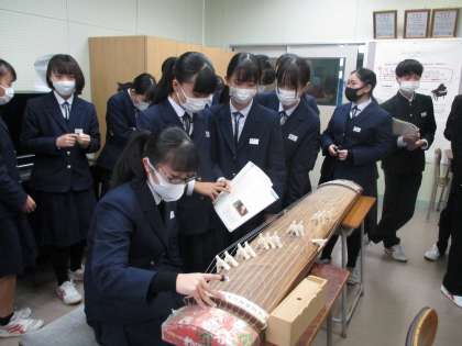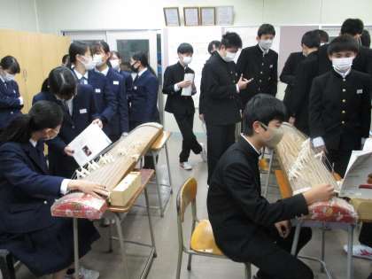 3年・音楽・箏の体験 公開日 2021/02/16 更新日 2021/02/16 今日の興南中 2月16日(火) 2,3限 興南中には箏が2面あります。 そこで、3年・音楽の授業で箏の体験をしました。 (写真:3年2,3組のようす) 爪をはめて、平調子で「さくらさくら」を演奏しました。 箏の音色を満喫し、心が落ち着きました。 和楽器って、いいですね。