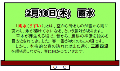 今日は、季節の指標である24節気の2番目の節気「雨水」です。
