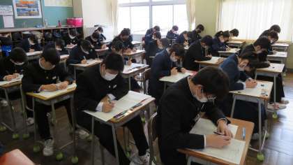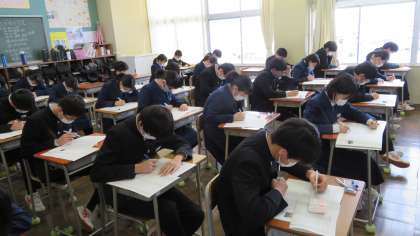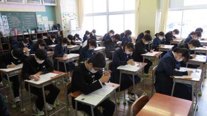 3年・学年末評価 公開日 2021/02/19 更新日 2021/02/19 今日の興南中 2月19日(金) 1限 英語 昨日は臨時休業でお休みだったので、3年・学年末評価は、今日一気に行います。 (1限:英語、2限:理科、3限:国語、4限:社会、5限:数学) (写真 上:3年1組 中:3年2組 下:3年3組) 中学校生活、最後の定期評価の感想は???