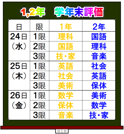 24日(水)から、「1,2年・学年末評価」です! 公開日 2021/02/21 更新日 2021/02/21 今日の興南中 2月21日(日) 11:00 24日(水)から、「1,2年・学年末評価」です。 (日程は、下記のとおりです。) 提出物はもとより、テスト勉強を計画的に進めましょう!