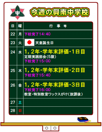 ★今週の興南中学校★ 公開日 2021/02/21 更新日 2021/02/21 今日の興南中 2月21日(日) 15:00 1,2年生のみなさん 24日(水)から「学年末評価」が始まります。 (今回は、26日まで「部活動中止期間」です。) (部活動再開は、27日(土)からです。) PS 今週も、毎日、下校完了時刻が変わります。要チェックです!