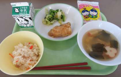 今日の給食の献立は、「ちらし寿司・牛乳・揚げ魚のみぞれだれ・なばなひたし・すまし汁・ひなあられ」です。(写真:上)