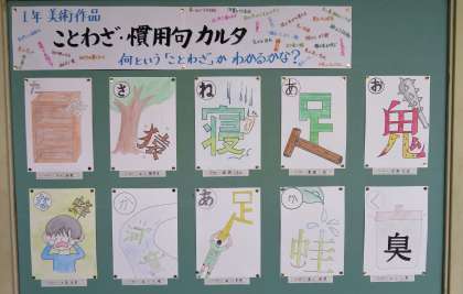 1年・美術・「ことわざ・慣用句カルタ」 公開日 2021/02/23 更新日 2021/02/23 今日の興南中 2月23日(火) 17:00 2階・多目的室前掲示板に、1年・美術作品「ことわざ・慣用句カルタ」優秀作品が掲示されました。 「なるほどねぇ〜」と感心する作品が勢揃いです。 ぜひ生徒のみなさんも鑑賞しましょう!