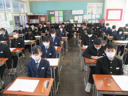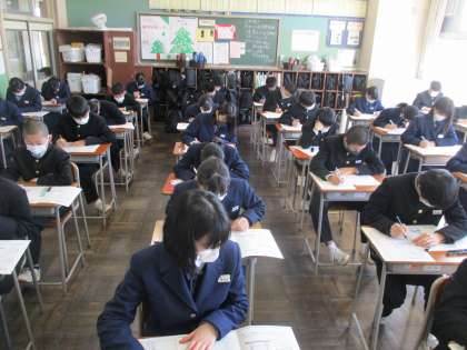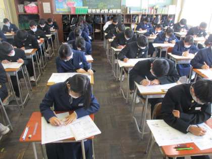 (写真 上:1年1組 テスト前に集中心を高めています)