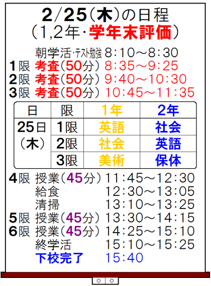 明日は、「1,2年・学年末評価」2日目です! 公開日 2021/02/24 更新日 2021/02/24 今日の興南中 2月24日(水) 17:00 1日目が終わり、明日は2日目です。 (日程は、下記のとおりです。) 1,2年生のみなさん 時間を有効に活用して、テスト勉強を進めましょう!