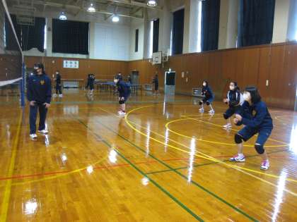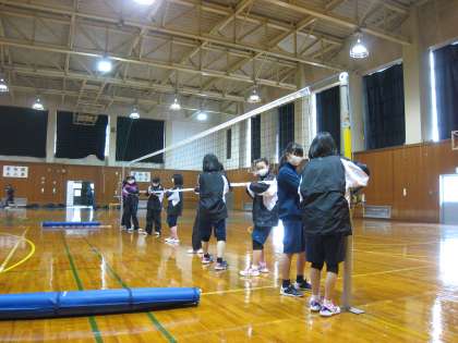 バレーボール部は、全員でネットの準備をします。(写真:上)