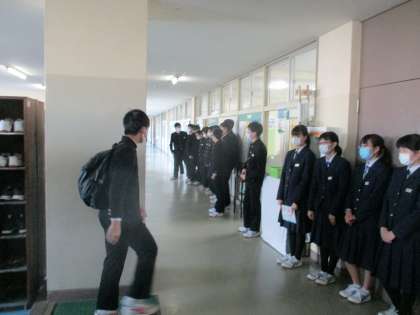 生徒玄関内で登校してきた生徒への挨拶を行いました。