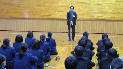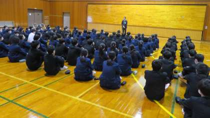 県立高校一般選抜を明日に控え、体育館で事前集会を行いました。