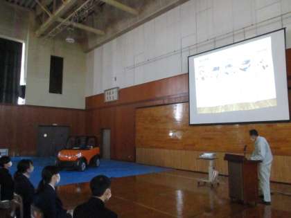 1年生は、タケオカ自動車工芸の武岡さんを招いて「働く人に学ぶ講演会」を行いました。