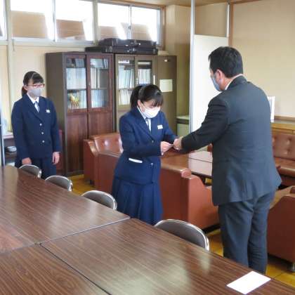校長先生の激励の言葉(写真:左)のあと、校長先生に教育後援会、育友会からの激励金を渡していただきました。(写真:右)