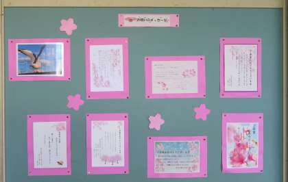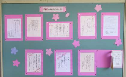 中央階段横の1階・掲示板に、「祝辞・祝電・お祝いメッセージ」が掲示されています。