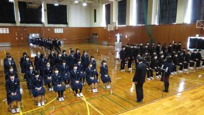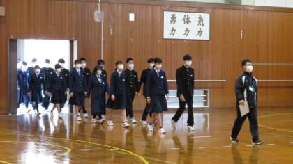 3年・卒業式入退場の練習 公開日 2021/03/15 更新日 2021/03/15 今日の興南中 3月15日(月) 2,3限 3年生は、2,3限、体育館で卒業証書授与の練習をしました。 (写真 上、中:入場の練習 下:退場の練習) 当日の流れを頭の中にたたき込んでいます!
