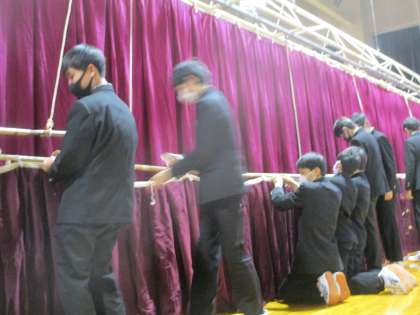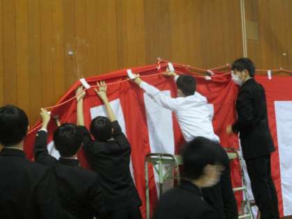 2年生男子は、体育館で紅白幕やステージ幕の準備をしました。