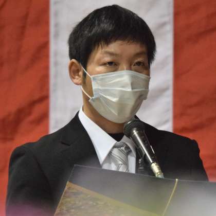 (写真 中:3年2組担任 加野先生)