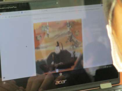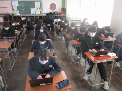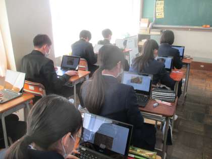 2年・社会・「クロームブックの活用」 公開日 2021/03/18 更新日 2021/03/18 今日の興南中 3月18日(木) 4,5限 2年の社会は、クロームブックを使って授業をしました。 歴史上の人物の名前、制作した作品等について用意された選択肢から正解を選んで先生のクロームブックに答えを送信します。 生徒は、先生が伝える質問の正答率について、興味深く聴いていました。 (写真 上:2年2組 中:2年3組 下:この人物は誰だろう?)