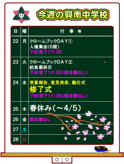 ★今週の興南中学校★ 公開日 2021/03/21 更新日 2021/03/21 お知らせ 3月21日(日) 10:00 3学期も残すところ、あと3日になりました。 24日(水)は、「令和2年度 修了式」です。 25日(木)から4/5(月)まで、春休みになります。
