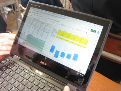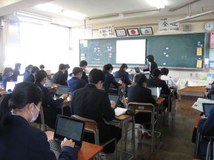 朝、生徒は自席にクロームブックをもってきて準備し、様々な授業でクロームブックを使って学びます。