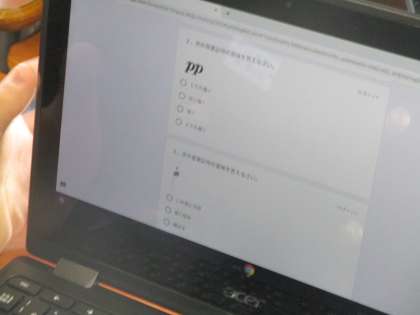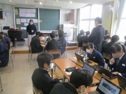3月22日(月) 3限 2年1組は、音楽の授業で、グループで協力して小テストに挑戦中です。