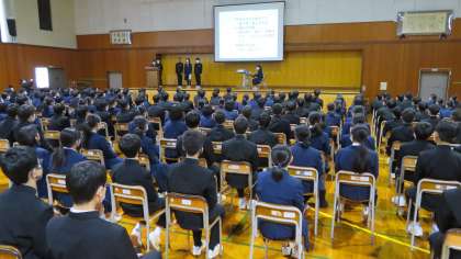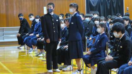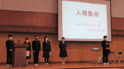 生徒会・「人権集会」 公開日 2021/03/22 更新日 2021/03/22 今日の興南中 3月22日(月) 6限 体育館で、生徒会主催の「人権集会」を行いました。 今日の集会では、人権問題の中でも「いじめ」に着目し、どんなことがいじめに当たるのか、日常生活の身近な例について全員で考えました。 周囲の友達と意見を交換し、何人かの生徒がインタビューに答えました。 また、教室に戻ってから、「興南中学校人権宣言」を書きました。